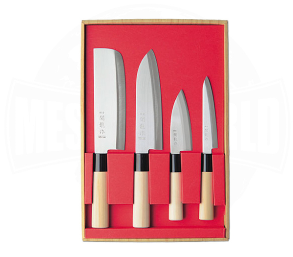 Schönes Messer-Set bestehend aus vier Messern mit Holzgriff. Die Klingen der Messer sind aus dem rostfreiem 420-J2 Stahl gefertigt. Der Griff ist aus naturbelassenem Holz mit Kunststoffzwinge. Lieferung in einer dekorativen Geschenkschachtel.